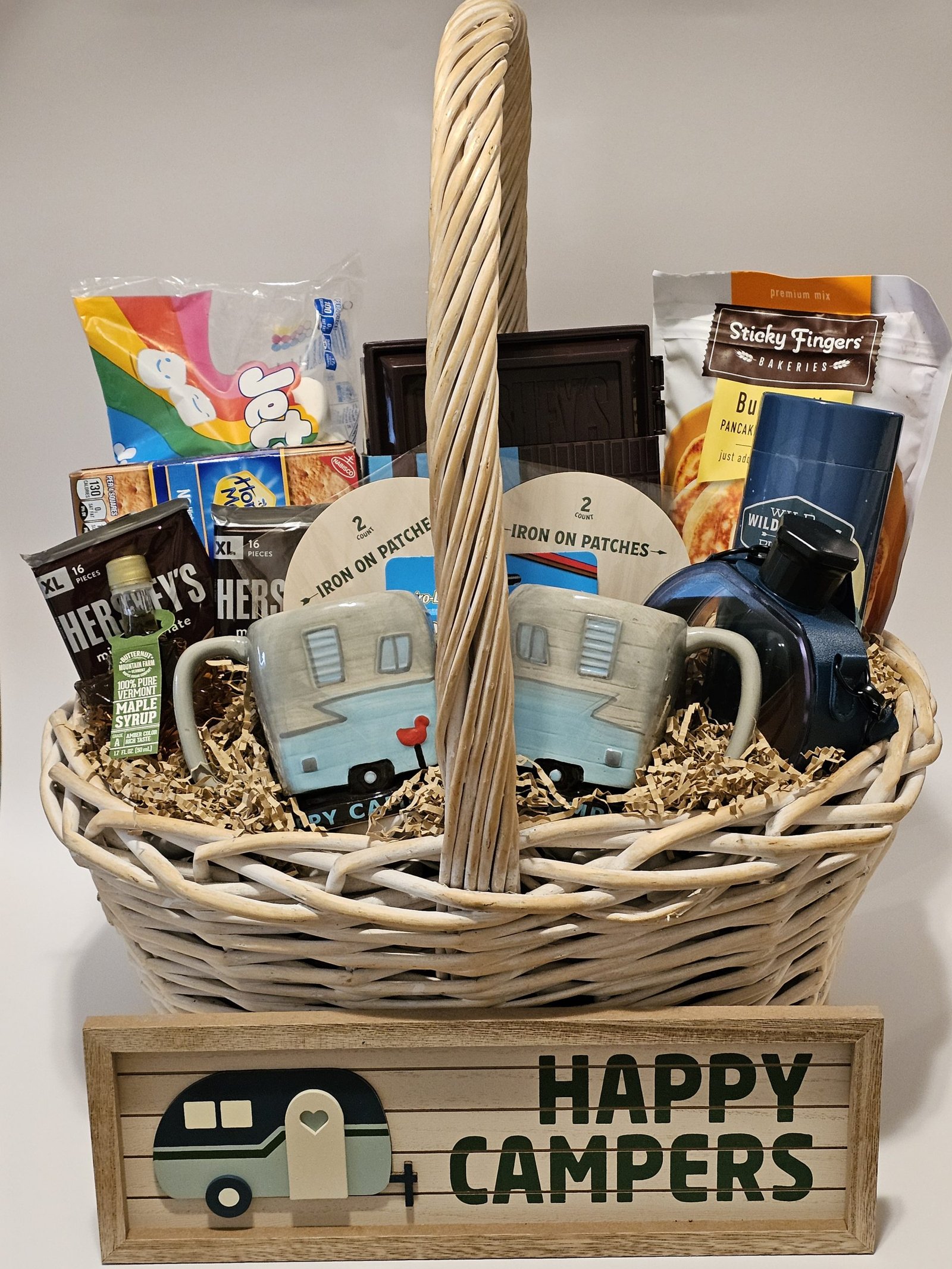 In this fun basket you’ll find everything you need for a great night of camping. To start with there is a big plastic Hershey’s box to hold all your smores goodies, but included is your marshmallows, graham crackers, and world famous Hershey chocolate bars. A box of flame color change to make your campfire more fun. A puzzle to keep you busy after a long day of hiking. A nice canteen to keep you nice and hydrated, then the next next morning there is some pancake mix, some maple syrup, and two cute camper coffee mugs to enjoy your morning cup of coffee, Then to commemorate your trip there are some iron on patches to put on a jacket or shirt. This is all tucked nicely in a large wooden basket. It is also included with a cute wooden sign that says “Happy Camper” This basket is sure to please the biggest outside enthusiast.