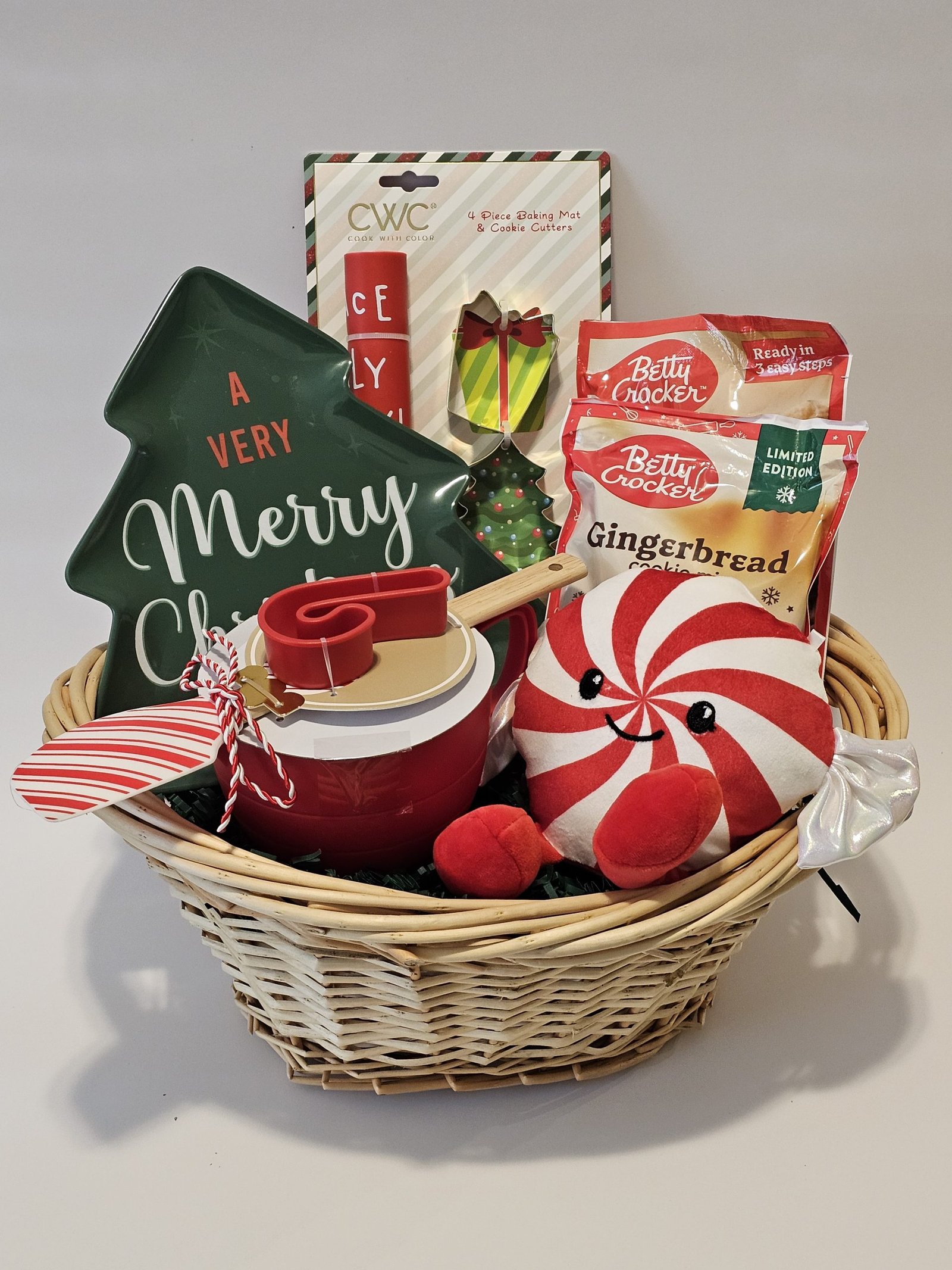 In this cute basket we have included a baking mat along with the cutest cookie cutters, and let’s not forget the cookie plate for Santa. You will also find a cute red cup with a spatula great for stirring the cookie batter and one extra cookie cutter. You’ll want to bake Santa’s favorite cookies so we have included Betty Crocker’s Snickerdoodle and Gingerbread cookies. You’ll also find the sweetest little treat “Mr. Peppermint Candy” a plush toy to add some Christmas joy. This little basket is sure to be a treat!